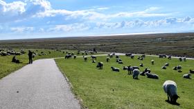 Menschen und Schafe am Deich