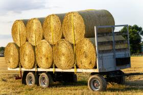 Das Bild zeigt einen landwirtschaftlichen Anhänger, der mit Rundballen beladen ist.