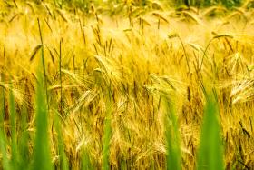 Das Bild zeigt ein goldenes Weizenfeld, das kurz vor der Ernte steht. Es handelt sich um Weizen (Triticum), eine der weltweit wichtigsten Getreidearten. Die Körner werden hauptsächlich zu Mehl für Backwaren verarbeitet oder als Tierfutter genutzt.
